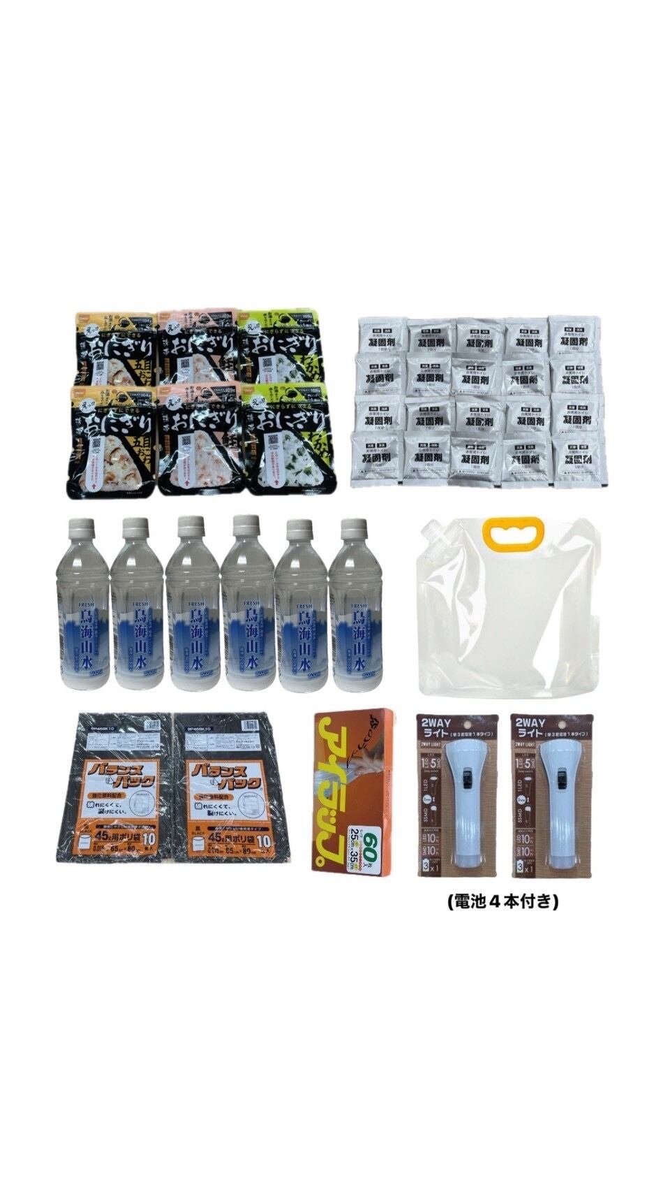 「安心!備蓄セット」は、突然の災害や緊急事態に備え、自宅での避難生活(在宅避難)に必要なものを厳選してまとめたセットです。保存水や非常食が多めに用意されており、断水時にも安心して使用できるトイレ凝固剤や、暗闇を照らす2本の懐中電灯などが含まれています。在宅避難生活を、より快適で安心なものにするために、このセットをお手元にご用意ください。